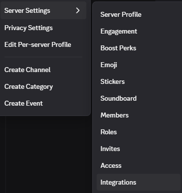 À fin de permettre l'interaction avec le serveur et plus spécifiquement un canal, il faudra créer une intégration pour votre serveur. Dirigez-vous dans "Server Settings" puis dans ""