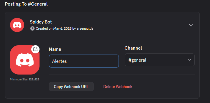 En cliquant sur le Webhook créé, vous pourrezl e renommer et sélectionner le canal auquel vous désirez l'assigner.