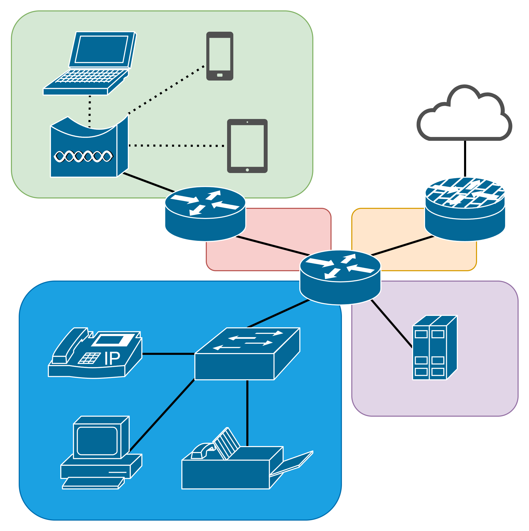 Dans l'exemple suivant, chaque encadré représenterait un domaine de diffusion de ce réseau. En haut à gauche, tous les appareils sans-fil seraient regroupés dans une même bulle et pourraient se contacter directement sans l'intermédiaire d'un routeur mais le routeur sera nécessaire pour contacter l'extérieur de leur réseau. La bulle en bas à gauche est le même concept mais plutôt que d'être regroupés ensemble par un point d'accès sans-fil, le domaine de diffusion est étendu par un commutateur.