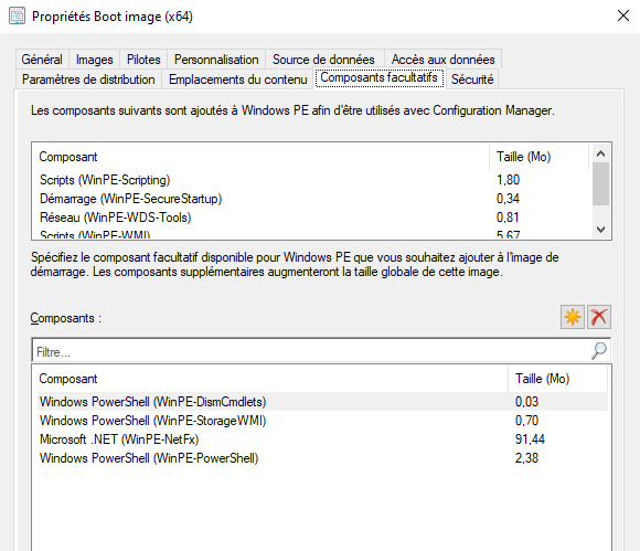 L'onglet "Composants factulatifs" nous permet d'ajouter et retirer des fonctionnalités à notre environnement WinPE. Une liste de composants requis par Configuration Manager se situe au haut de l'onglet mais la section du bas nous permet d'ajouter ou retirer des fonctionnalités à WinPE.