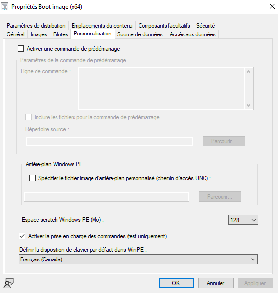 Il est aussi possible de modifier certains paramètres directement avec Conffiguration Manager plutôt que d'ouvrir le .wim et d'y appliquer manuellement vos modifications. Une panoplie d'options nous sont présentées lorsque nous accédons aux propriétés de l'image de démarrage.