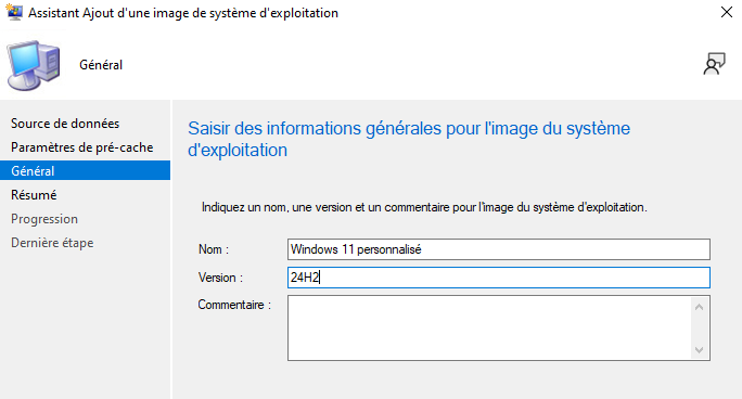 La section "Général" de l'assistant permet de nommer le WIM dans l'infrastructure Configuration Manager pour pouvoir l'identifier lorsqu'il sera sélectionné dans d'autres sections de Configuration Manager telles que les séquences de tâches.