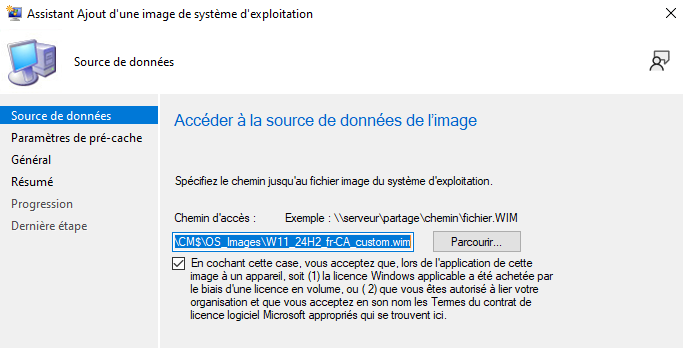 Pour importer une image de système d'exploitation, il suffit de sélectionner le fichier WIM à importer à partir d'un partage réseau (pour que tous les points de distribution de l'infrastructure aient accès à la source) et d'accepter les termes et conditions. Cette tâche est généralement effectuée lorsqu'on désire déployer une version modifiée d'un fichier WIM d'installation (ex. une version qui inclurait des modifications au registre où une image incluant des mises à jour Windows) ou qu'on désire déployer une version plus récente de Windows.