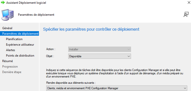 Pour permettre l'exécution d'une séquence de tâche, il faut la mettre à disposition des clients. Il est possible de déployer des séquences de tâches de différentes façon. Il est possible de les déclencher à partir du client Configuration Manager sur des appareils appartenant déjà au site CM, il est possible de les déployer par PXE pour les appareils démarrant à partir du réseau et il est possible de créer un média de séquence de tâche comme une clé USB ou un ISO déclenchant son exécution.
