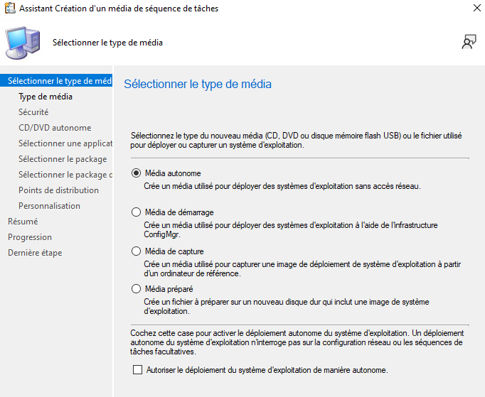 Plusieurs options existent pour un média de séquence de tâches. Les deux options les plus intéressantes sont le média autonome et le média de démarrage. Le média de démarrage remplace PXE et ira chercher auprès du serveur Configuration Manager les séquences de tâches disponibles et les exécutera en téléchargeant le contenu à partir du réseau. Le média autonome contiendra quant à lui toutes les données requises pour l'exécution de la séquence de tâche et ne nécessitera donc pas d'accès au réseau.