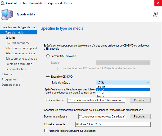 Si la case "Autoriser le déploiement du système d'exploitation de manière autonome" est cochée, la séquence de tâche démarrera automatiquement suite au démarrage du média. Il est possible lors de la sélection du type de média de créer soit un lecteur USB démarrage, un ISO ou plusieurs ISO advenant le cas où l'on voudrait graver l'image sur des DVDs.