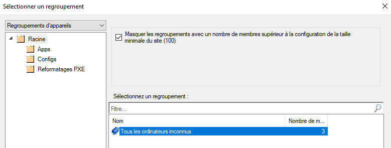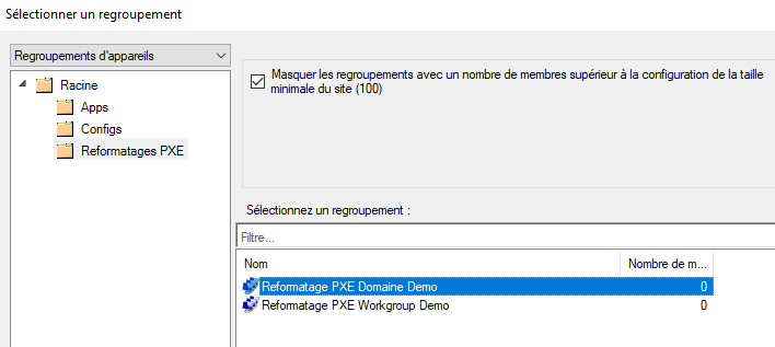 Dans le cas où l'on voudrait forcer le reformatage de postes de travail, il est possible de créer des regroupements et d'y associer des ordinateurs. Si la séquence de tâche y est déployée de façon obligatoire, les postes de travail concernés seront reformatés automatiquement à leur prochain redémarrage si le démarrage réseau est la première méthode de démarrage dans leur BIOS