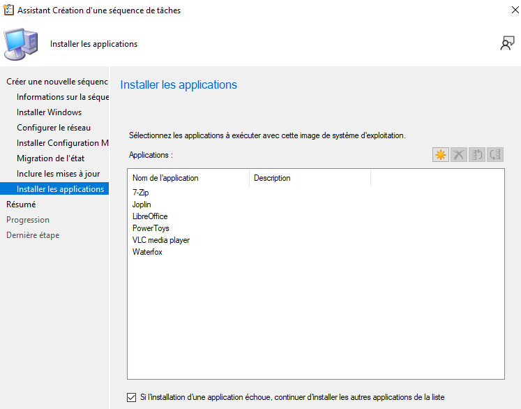 Pour terminer l'assistant de création, il nous sera ensuite demandé quelles applications doivent être déployées lors de l'exécution de la séquence de tâches. Ceci nous permet d'avoir, suite à l'exécution de la séquence de tâches, un poste de travail prêt à l'emploi avec une liste d'application préinstallées.