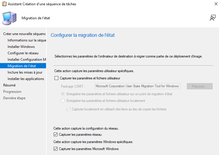 L'étape de la migration de l'état permet d'appliquer certaines consignes pour conserver la configuration de l'utilisateur ainsi que l'identité de la machine sur un domaine Active Directory si on voulait, à titre d'exemple, déployer un reformatage automatique d'un poste de travail.