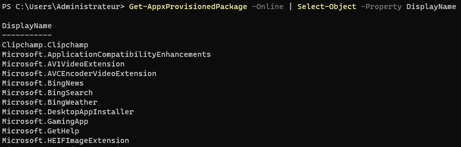 PS C:\Users\Administrateur> Get-AppxProvisionedPackage -Online | Select-Object -Property DisplayName