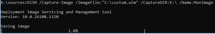 DISM /Capture-Image /ImageFile:"C:\custom.wim" /CaptureDIR:K:\ /Name:MonImage