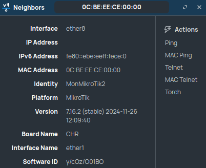 Vous pouvez à l'aide de MAC Ping, tester votre connexion. Ceci peut vous permettre de diagnostiquer par exemple un lien instable entre deux appareils. Vous avez aussi MAC Telnet, ceci vous permettra d'ouvrir une session à la ligne de commande.
