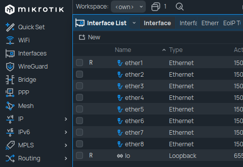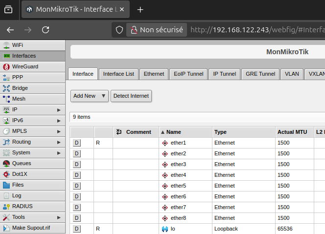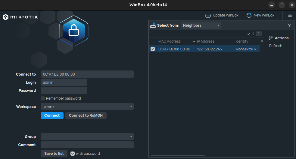 Cliquer sur son adresse IP remplira le champ par son adresse IP. Notez bien que si l'appareil est situé à l'extérieur de votre domaine de diffusion, vous devrez remplir le champ "Connect to" manuellement. On y trouvera ensuite la même structure d'interface que la page web. Notez ici que j'utilise Winbox 4.x mais toutes les mêmes options s'y trouvent.