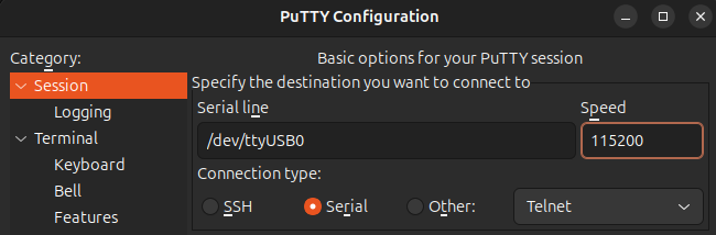 Pour les appareils le supportant, la connexion au port console doit être configurée du côté du client à une vitesse (baudrate) de 115200. Il est possible ici d'utiliser PuTTY sur Windows, Linux ou Mac ainsi que la commande "screen" sur Linux et MacOS.