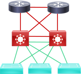 Dans une topologie à trois couches, on retrouve généralement des commutateurs de couche 3 qui offrent une redondance comme point de sortie aux clients du réseau ainsi que des routeurs de cœur permettant d’échelonner le réseau dans différents domaines de broadcast plus facilement. Les pare-feu sont généralement reliés aux routeurs situés derrière d’autres commutateurs de couche 3.