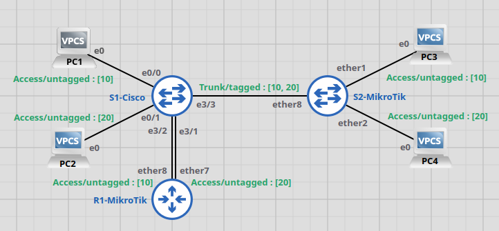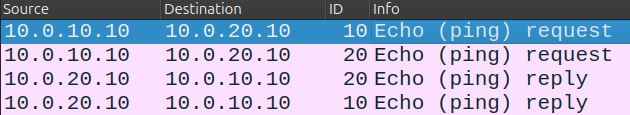 On observe ici que la requête ICMP arrive dotée de l'étiquette de VLAN (ID) 10 pour permettre au routeur d'assigner ce trafic à son interface VLAN 10 et ressort dotée de l'étiquette de VLAN 20 pour que le commutateur sache à quel VLAN assigner le message et le même processus à l'envers est appliqué pour acheminer la réponse.